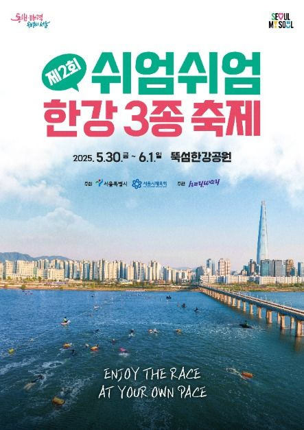 <쉬엄쉬엄 한강 3종 축제>는 순위나 기록 경쟁 없이 수영, 자전거, 달리기를 완주하는 체육 축제이다. 작년 6월에 첫 개최하여 경기 참가자 1만 명을 포함한 총 63만 명이 방문하며 시민들에게 큰 사랑을 받았다. <제2회 쉬엄쉬엄 한강 3종 축제>는 올해 2일 개최에서 3일로 기간을 확대하여 5월 30일(금)부터 6월 1일(일)까지 뚝섬한강공원에서 열린다. 경기에는 총 3만 명이 참여할 예정으로 참가자들은 자신의 체력 수준에 따라 코스를 선택해 3일 동안 ‘나만의 속도와 방식’으로 수영, 자전거, 달리기 3가지 종목을 완주하면 된다.