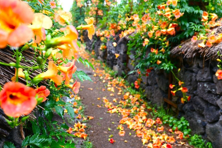 하늘을 능가하는 아름다운 능소화꽃이 일천여미터의 규모로 펼쳐지는 제주 여름꽃축제다. 주홍색 꽃비가 내리는 매혹적인 아름다움을 보고 느끼고 즐기는 능소화축제다.