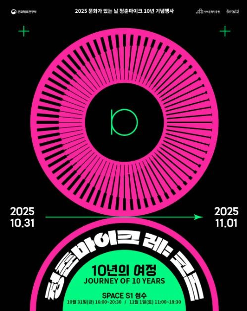 '문화가 있는 날 청춘마이크'가 10년을 맞이했다. 지난 10년간 청춘마이크는 지역 곳곳 일상 공간에서 청년 예술가들의 공연으로 국민에게 특별한 문화의 순간을 선사해왔다. 이를 기념해 10월 31일(금)부터 11월 1일(토)까지 성수 SPACE S1에서 다양한 프로그램이 펼쳐진다. 행사 기간, 청춘마이크 청년예술가들의 공연과 10년의 발자취를 담은 전시와 체험 프로그램이 준비되어 있다. 청춘마이크가 걸어온 길을 함께 돌아보고, 앞으로의 새로운 여정을 함께 그려보는 행사로 초대한다.